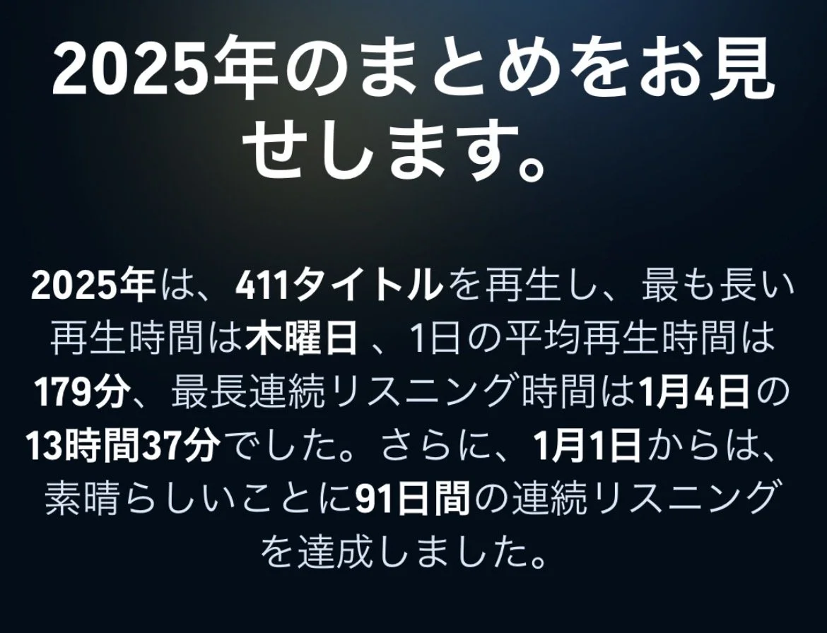 某オーディオブックサービスの2025年中の利用実績が添付の通りでした 411タイトルも読書(聴書)していたなんて驚きです ウォーキングとオーディオブックはとても相性が良いですね